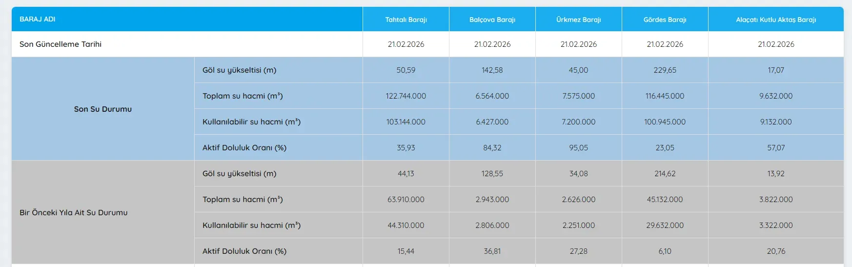 İzmir’i besleyen barajlarda son yağışların ardından doluluk oranlarında önemli bir artış yaşandı. 21 Şubat 2026 tarihli verilere göre, İzmir’deki birçok barajda su seviyeleri geçen yıla kıyasla dikkat çekici şekilde yükseldi.