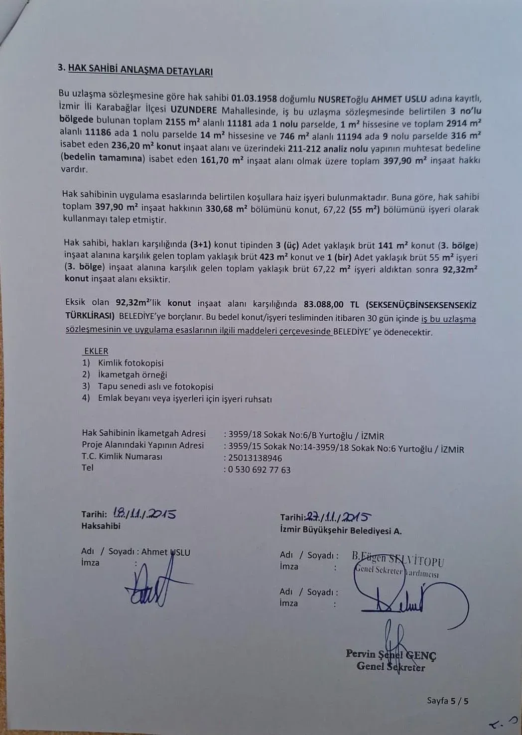 Platform sözcüsü Eray Uslu tarafından paylaşılan 2015 tarihli resmi uzlaşma tutanağına göre, 18 Kasım 2015’te İzmir Büyükşehir Belediyesi ile hak sahipleri arasında sözleşme imzalandığı ve vatandaşların taşınmazlarına karşılık alacakları konut ve işyeri metrajlarının belirlendiği kaydedildi.